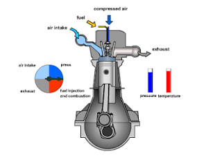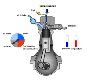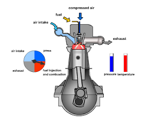 Sekali lagi perlu diingat bahwa mesin diesel tidak memakai busi, pembakaran yang terjadi karena tekanan kompresi,suhu udara yang tinggi dan bahan bakar yang disuntikkan bertekanan tinggi langsung ke ruang bakar (direct injection). Panas dan tekanan tinggi inilah yang akan membakar bahan bakar dengan sendirinya.